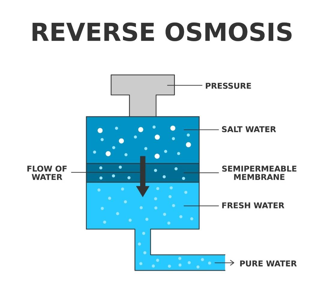 หลักการทำงานของเครื่องกรองน้ำRO Reverse Osmosis System จะทำงานแบบย้อนกลับจากระบบ Osmosis โดยการดันน้ำที่มีสารละลายเข้มข้นสูงดันผ่านเยื่อเมมเบรนไปสู่น้ำที่มีสารละลายความเข้มข้นน้อย โดยใช้ปั๊มน้ำแรงดันสูงอาร์โอนั่นเอง