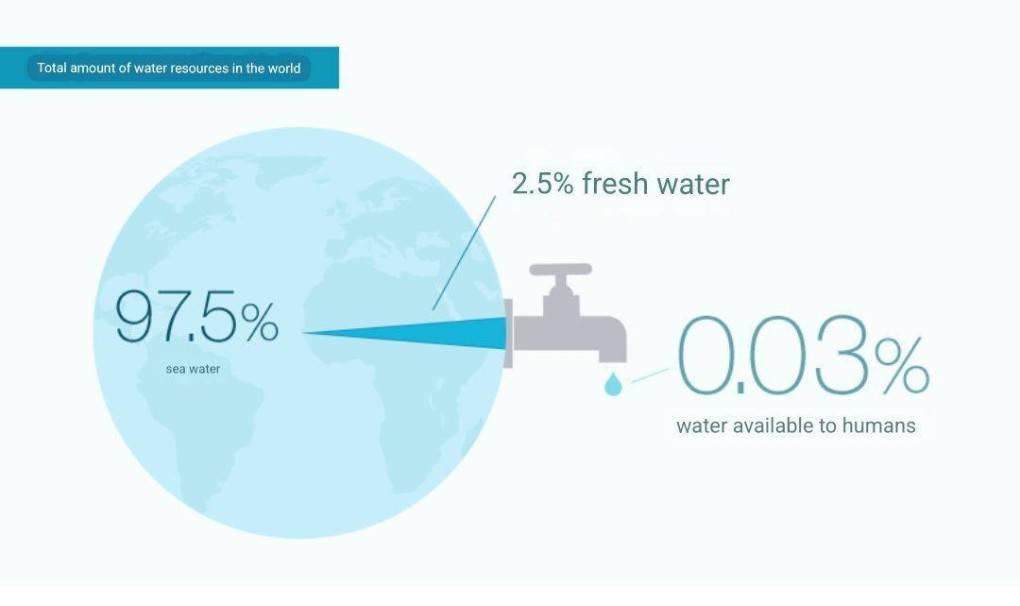 97% คือน้ำเค็ม ในมหาสมุทรที่ไม่สามารถดื่มได้ 2% คือน้ำแข็ง ที่ขั้วโลกและธารน้ำแข็ง