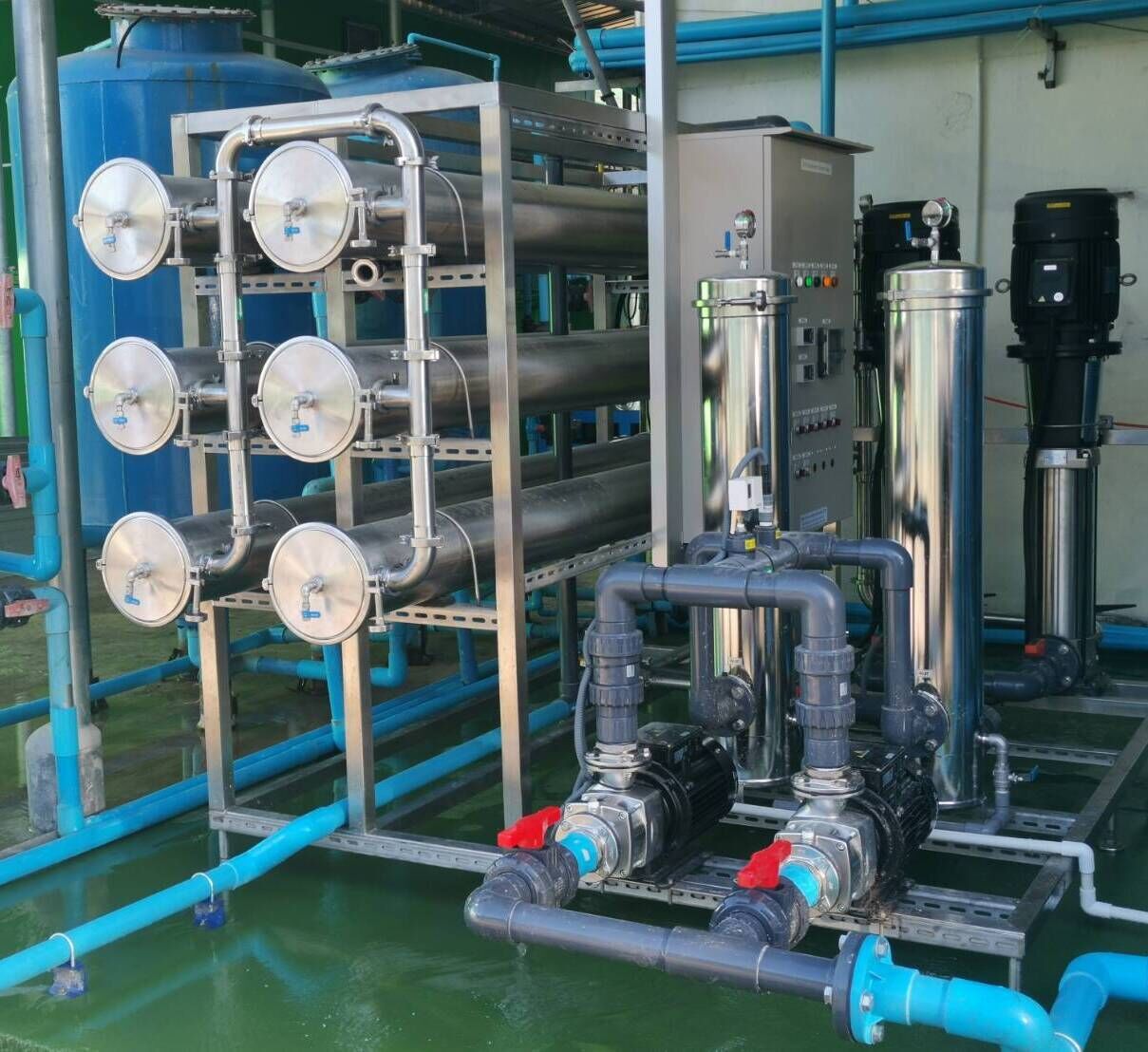 -การกรองจะสูบน้ำดิบผ่านระบบกรองเบื้องต้น หรือPretreatment Filter เพื่อกรองตะกอน คลอรีนตกค้าง สนิมเหล็ก หินปูนในน้ำ ก่อนเข้าเครื่องกรองน้ำระบบReverse Osmosis โดยผ่าน กระบอกกรองน้ำละเอียด 5 ไมครอน ผ่านปั๊มแรงดันสูง(High Pressure Pump)เพื่ออัดเข้าเมมเบรนอาร์โอ(Membrane RO) ผ่านกระบอกเมมเบรนอาร์โอหรือHousing Vessel Membrane RO